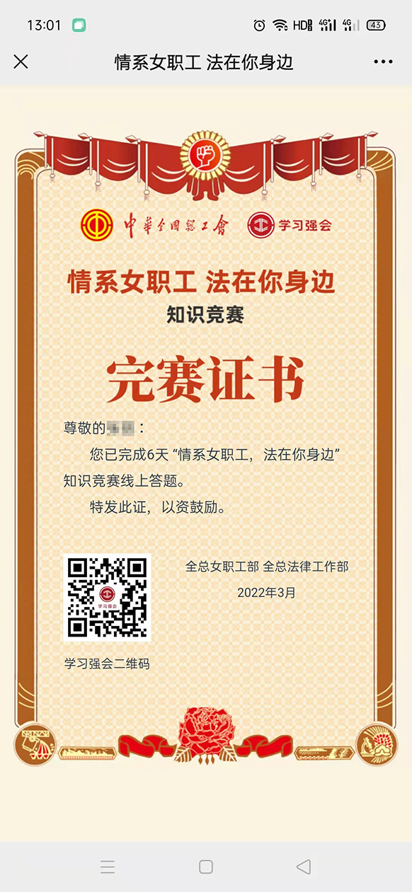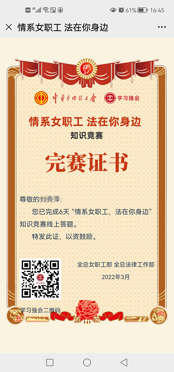 节日前夕,各党支部依托“三会一课”、职工微信群、“学习强国”等平台,专题学习了《中华人民共和国工会法》,围绕“情系女职工 法在你身边”主题,联合女工委组织参与了普法竞赛活动,进一步提高了女职工的法治意识和维护自身合法权益的能力。