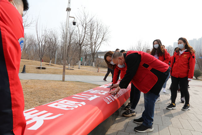活动当天,志愿者们身穿红色志愿马甲,以绿色低碳的方式,集体步行到达和平公园,捡拾清理健身步道、绿化带中的烟头、杂物、垃圾等,清理完毕后,按照垃圾分类标准,将垃圾统一投入到规定垃圾箱内。志愿者们还向过往群众积极宣传生态环保知识,并在宣传条幅上签字留念,展示大家致力于环境治理的坚毅决心和良好精神风貌。