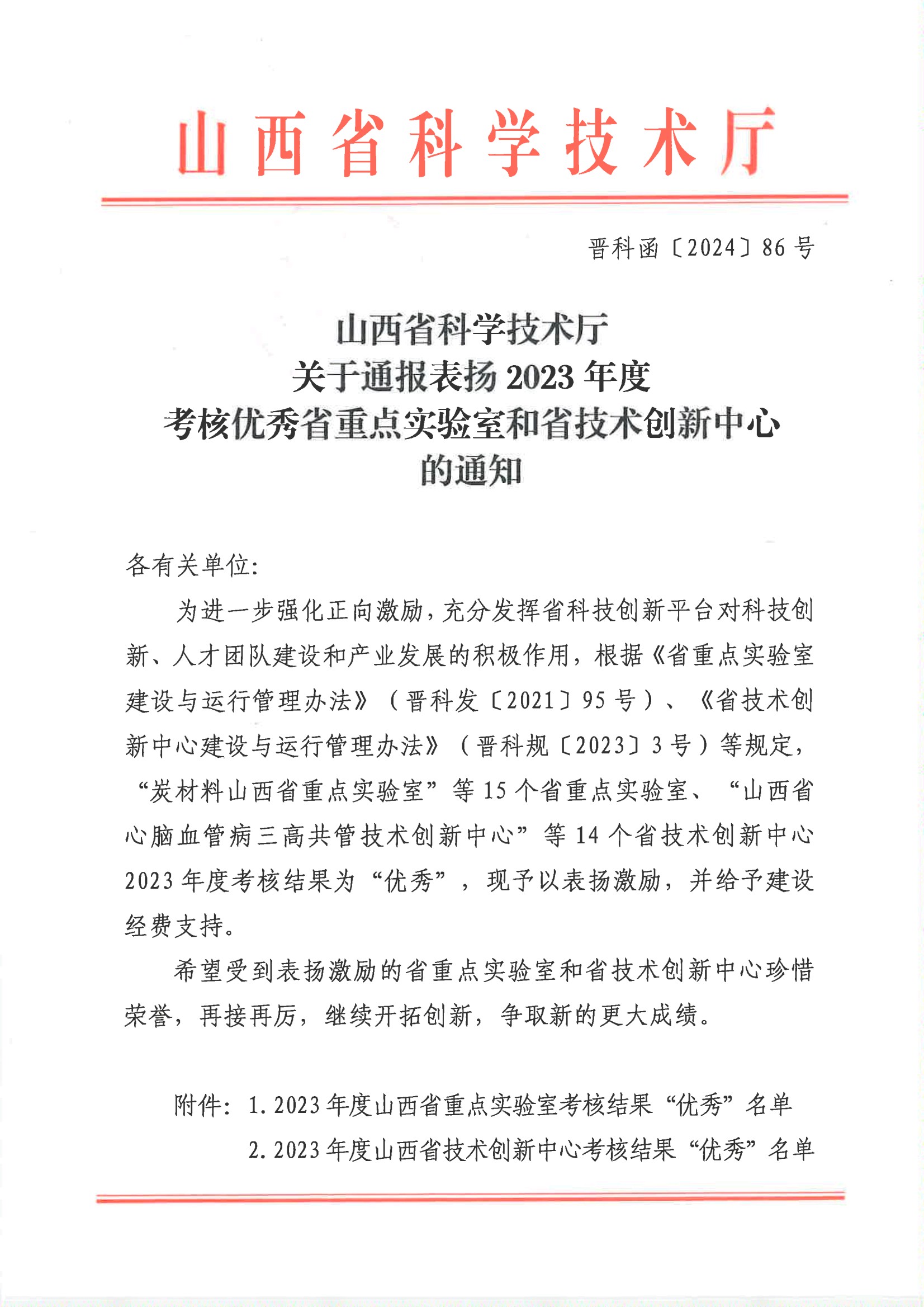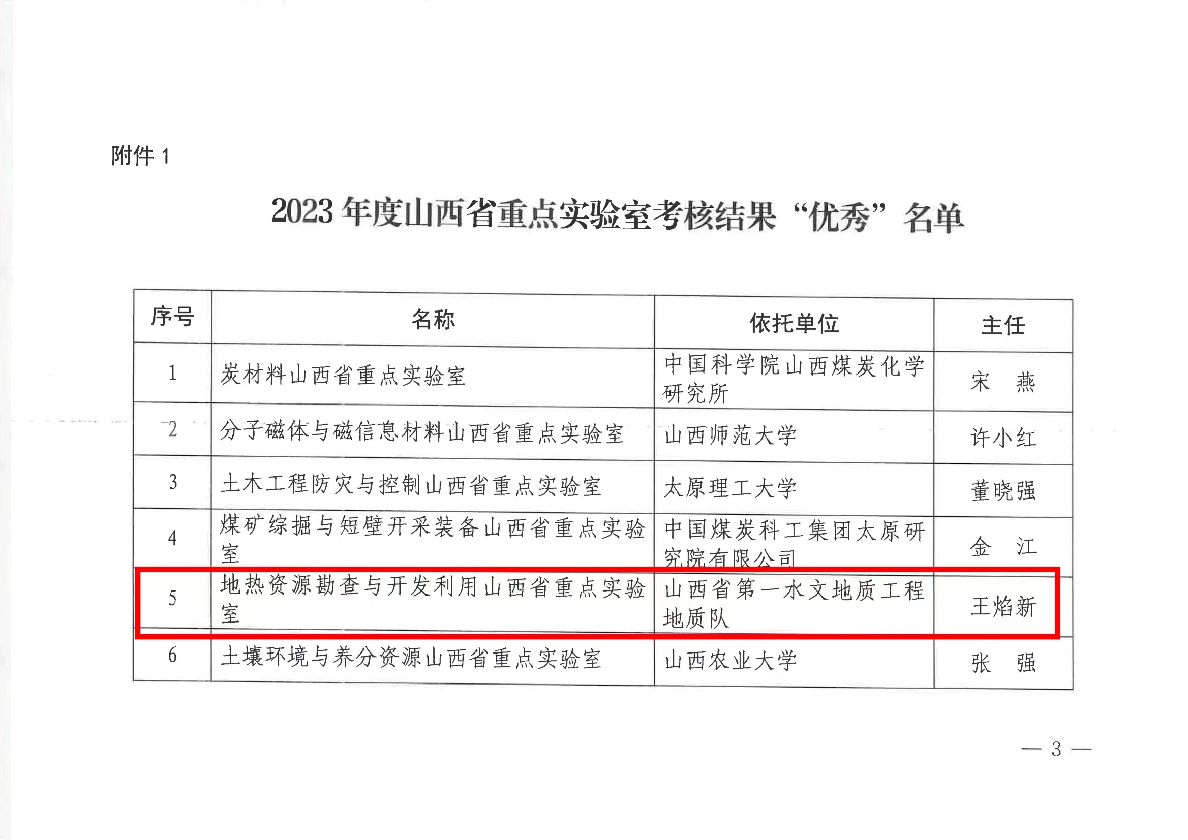 6月13日,山西省科技厅下发《山西省科技厅关于通报表扬2023年度考核优秀省重点实验室和省技术创新中心的通知》,对15个省重点实验室和14个省技术创新中心予以表扬激励,并给予建设经费支持,以我公司(原山西省第一水文地质工程地质队)为依托单位建立的“地热资源勘查与开发利用山西省重点实验室”位列其中,获2023年度考核“优秀”!