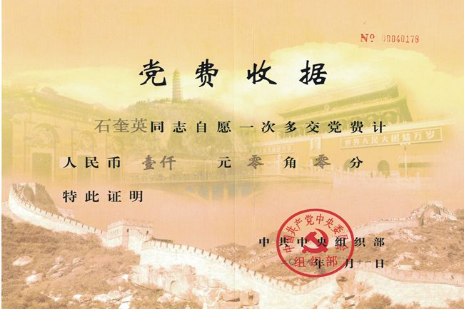 石奎英系我队退休职工,曾任原探矿机械厂副厂长,任职期间,兢兢业业,带领职工谋发展,求出路,走市场。退休后,他拥护、热爱中国共产党的热情始终不减,自觉学习党章党规,坚定对党的信仰。2019年7月,他郑重地把一笔怀揣着对党感恩的党费1000元递交到离退休党支部,除了正常按时缴纳党费,自愿向党组织一次多交党费,离退休党支部第一时间把这笔自愿多交党费及时转交回上级党组织。