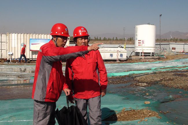 在施工工地现场,队领导多方面调研,详细了解工程进展,并就下一步具体施工方案提出了指导性意见。党委书记郭红党指出,该干热岩勘探孔已取得大量原始地质及钻探数据,经专家分析,有望为华北地区创造新的地热能发现,目前施工进入关键期,望大家继续发挥地勘人“三光荣、四特别”精神,一鼓作气,获取最终成功。水井公司经理、特钻部负责人李海军,特钻部技术负责荆京和CMD150T钻机机长刘巨彬一致表示,项目组全体成员将继续团结一致,群策群力、迎难而上,圆满完成队领导安排的任务。